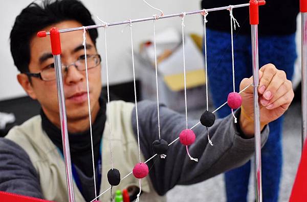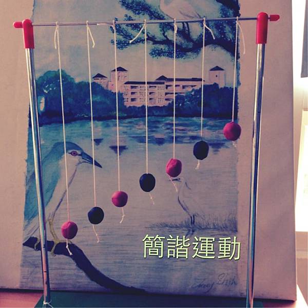 ▼共振擺:步驟二:前後方向先擺動黑色黏土的擺錘,會發現黑色黏土擺錘快停下來時,變成紅色黏土的擺錘在擺動,然後持續互相影響著,然後再慢慢靜止。